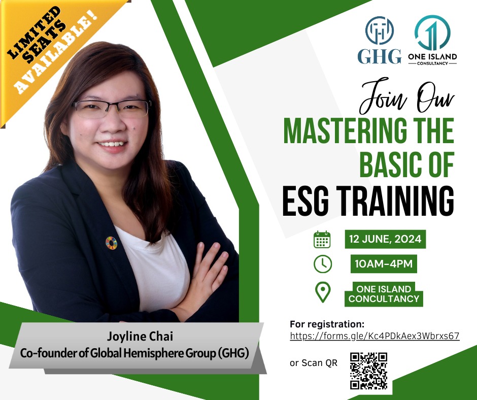 Unlock the Future: Join our Exclusive ESG Training Session – Limited Seats Available! Embrace Sustainability, Gain Insights, and Secure Your Spot Today! Date – 12 June 2024Time – 10am – 4pmLocation – One Island Consultancy Registration linkhttps://forms.gle/Kc4PDkAex3Wbrxs67